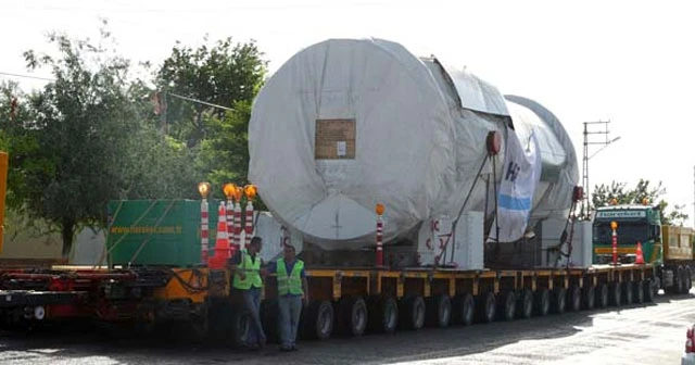 Kırklareli'nin Lüleburgaz ilçesinde bulunan Hamitabat Doğalgaz Kombine Çevrim Santralinde kullanılmak üzere Almanya'dan getirilen 480 ton ağırlığındaki doğalgaz türbini, 240 tekerleği bulunan tır ile taşınıyor.