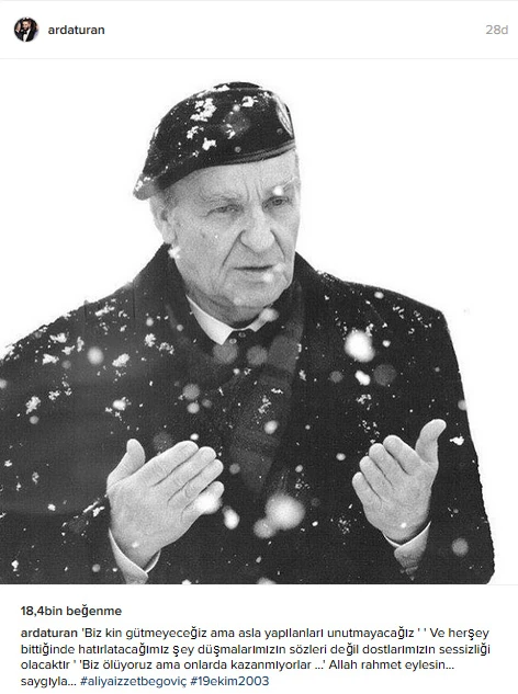 “Bugün Aliya İzzetbegoviç’in vefatının 13. yıldönümüğ. Savaş zamanı Bosna halkını ayakta tutmak için çalıştı. Bugün özgürlük için savaşan Mülümanlar’ın eksikliği Aliya gibi liderlerinin olmamasıdır. Her Müslüman’ın görevi onu unutturmamasıdır.