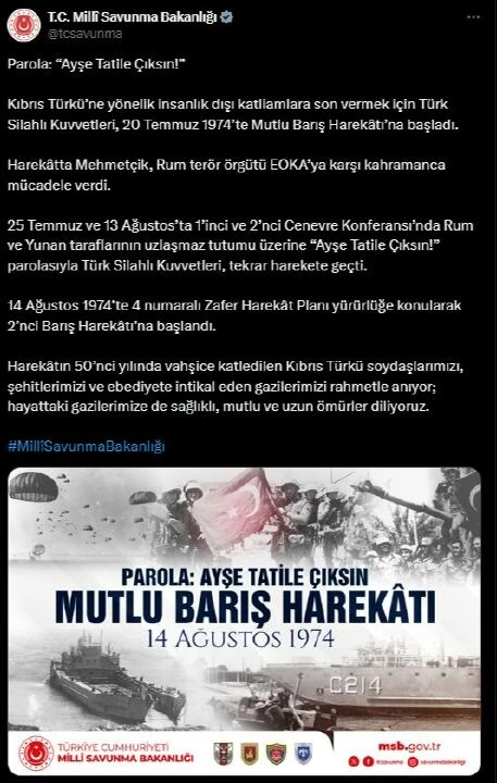 Kıbrıs Barış Harekatı'nın ikinci etabının başlamasının 50. yıldönümüne yönelik Milli Savunma Bakanlığı sosyal medya hesabından paylaşım yaptı.