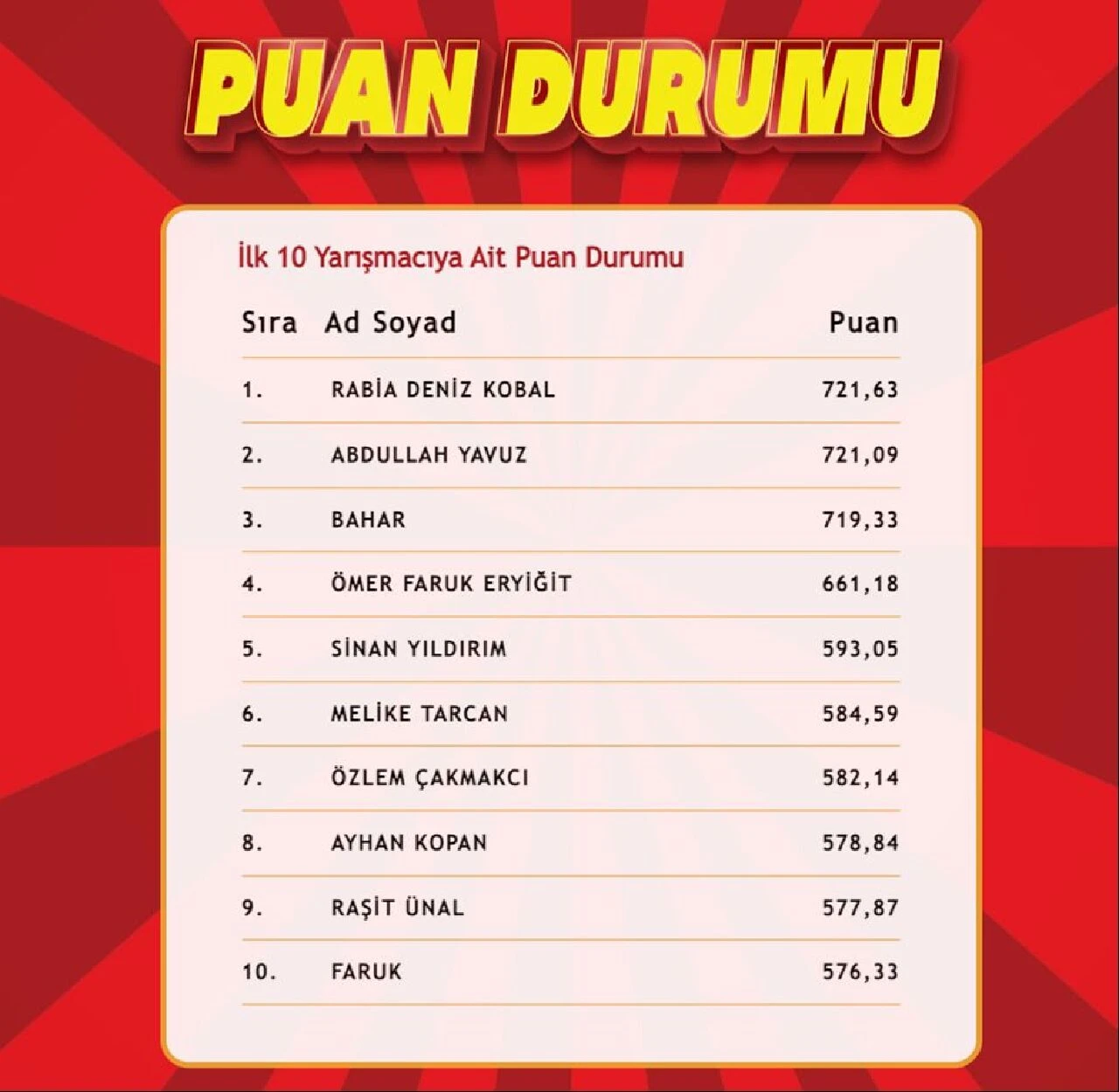 “Çözen Kazanır” programına katılan yarışmacılar arasında birinci olan ve ilk on sıraya giren isimlerin listesiyle birlikte cevap anahtarları saat 21.30’da tgrthaber.com ve sosyal medya hesaplarımızdan paylaşılıyor.