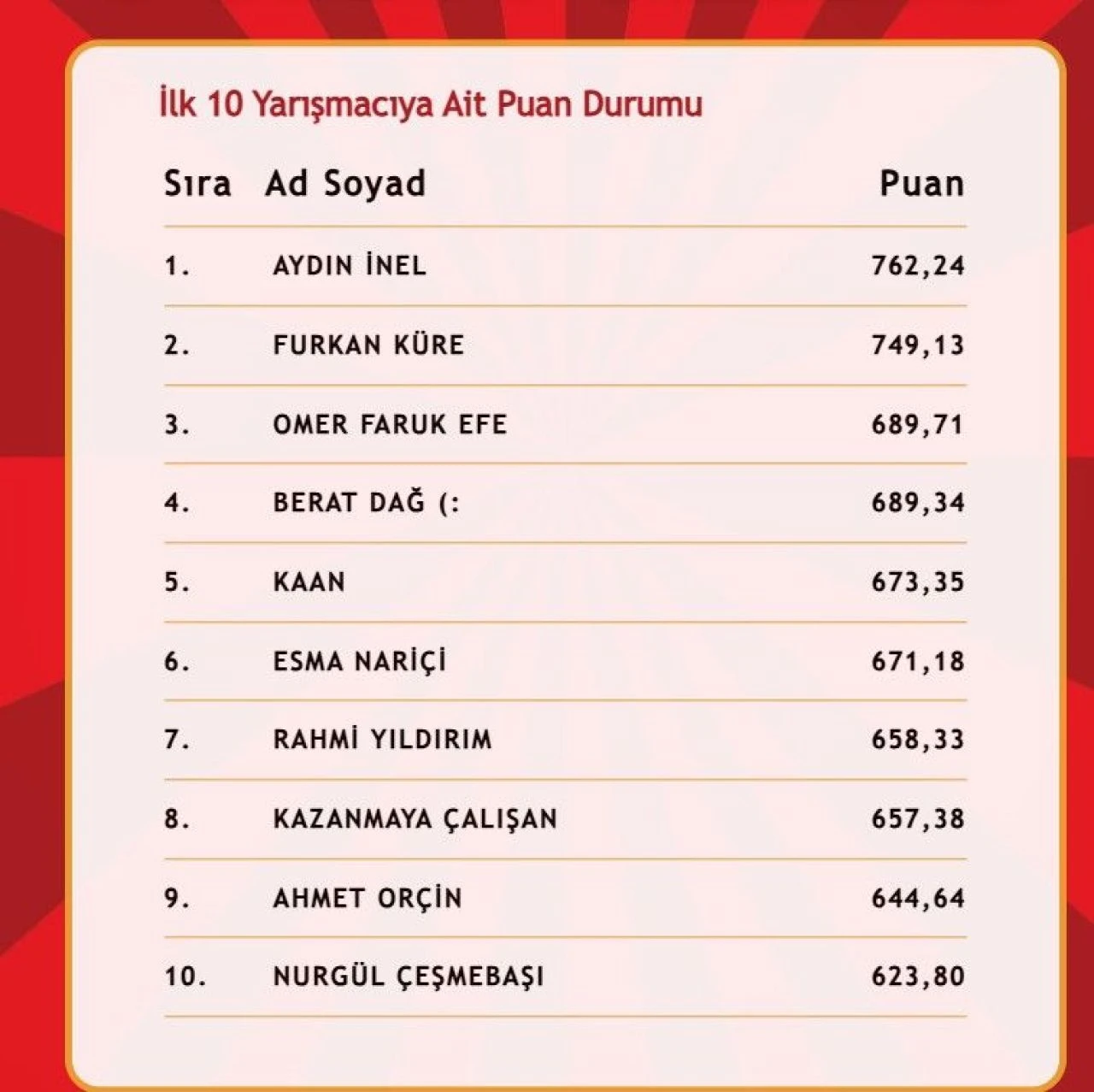 30 EKİM 2024 TARİHLİ ÇÖZEN KAZANIR’DA İLK 10’A GİREN YARIŞMACILARIN İSİMLERİ