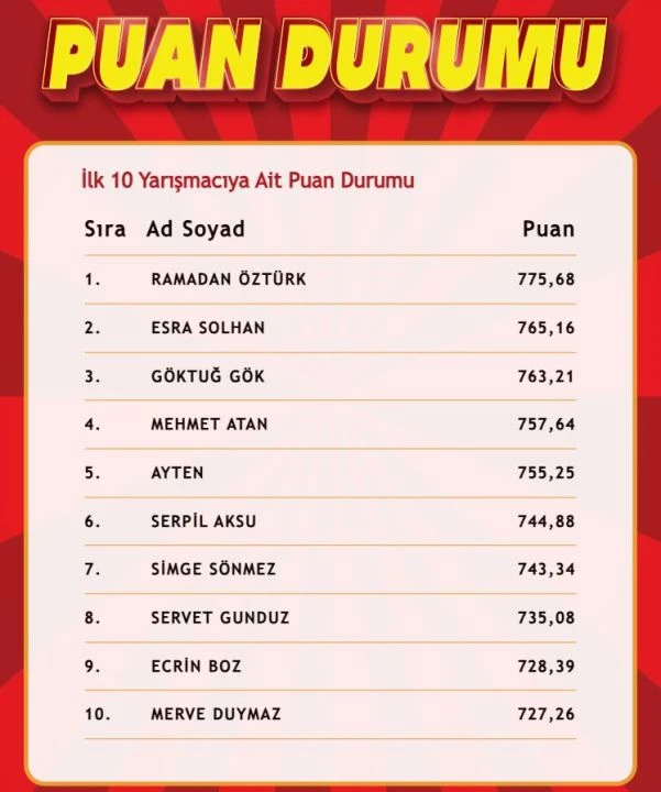 “Çözen Kazanır” programına katılan yarışmacılar arasında birinci olan ve ilk on sıraya giren isimlerin listesiyle birlikte cevap anahtarları saat 21.30’da tgrthaber.com ve sosyal medya hesaplarımızdan paylaşılıyor.