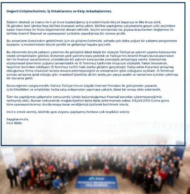4 yıl önce kurulan ve 2015 yılında geleceği en parlak girişimlerden biri olarak görülen incir.com tüm operasyonlarını durdurdu. 2016'nın başlarından itibaren büyümesi frene basan e-ticaret sitesi 15 Temmuz darbe girişimini takip eden pazartesi günü anlaştığı bir firmanın anlaşmayı iptal etmesiyle iyice dibe vurdu.