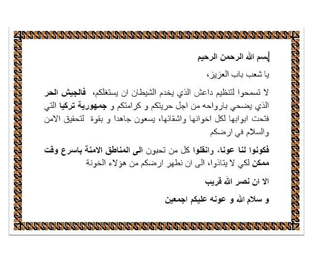 Türk Silahlı Kuvvetleri Fırat Kalkanı Harekatı kapsamında El Bab bölgesinde yaşayan sivillere uçaklardan bildiri dağıtıldığını açıkladı. Dağıtılan bildiride, "bize yardımcı olun ve bizler topraklarınızı bu hainlerden temizleyene kadar zarar görmemeleri için sevdiklerinizi en kısa sürede güvenli bölgelere taşıyın. Zafer Allah'ın izni ile yakındır" denildi. TSK'nın El Bab'a uçaklardan dağıttığı bildiri şöyle:" Bismillahirrahmanirrahim; değerli El Bab halkı,şeytana hizmet eden deaş terör örgütünün sizleri kullanmasına izin vermeyin. sizlerin özgürlük ve felahı için hayatını ortaya koyan özgür suriye ordusu ve kardeşlerine her zaman kapısını açan türkiye cumhuriyeti, topraklarınıza huzuru ve güveni getirmek için tüm gücüyle çaba sarfetmektedir. Bize yardımcı olun ve bizler topraklarınızı bu hainlerden temizleyene kadar zarar görmemeleri için sevdiklerinizi en kısa sürede güvenli bölgelere taşıyın. zafer allah'ın izni ile yakındır. Allah'ın selamı ve desteği üzerinize olsun."