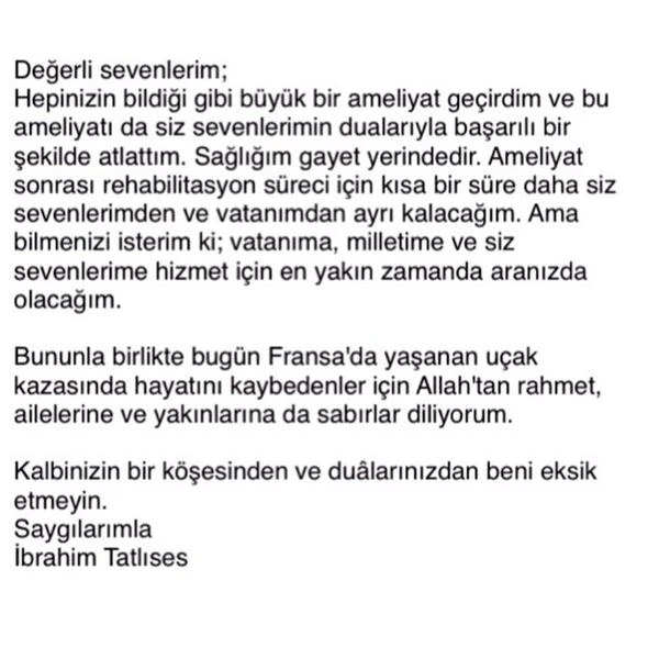 Uyandırılan sanatçı, yoğun bakım ünitesinden çıkarıldı ve normal odaya alındı. Tatlıses, ameliyat sonrası milletvekili adaylığına yönelik siyasi mesajlar da veren ilk açıklamasını Instagram hesabından paylaştı: "Değerli sevenlerim; hepinizin bildiği gibi büyük bir ameliyat geçirdim ve bu ameliyatı da siz sevenlerimin dualarıyla başarılı bir şekilde atlattım. Sağlığım gayet yerindedir. Ameliyat sonrası rehabilitasyon süreci için kısa bir süre daha siz sevenlerimden ve vatanımdan ayrı kalacağım. Ama bilmenizi isterim ki; vatanıma, milletime ve siz sevenlerime hizmet için en yakın zamanda aranızda olacağım.