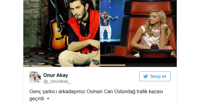 Kötü haberi sosyal medyadan duyuran şarkıcı Onur Akay meslektaşı Osman Can Üstündağ için iyi dileklerde bulundu; “Genç şarkıcı arkadaşımız Osman Can Üstündağ trafik kazası geçirdi. Kartal Eğitim ve Araştırma Hastanesi'nde yatan ve durumu ağır olan arkadaşımız için dua istiyorum.” mesajını yazdı.