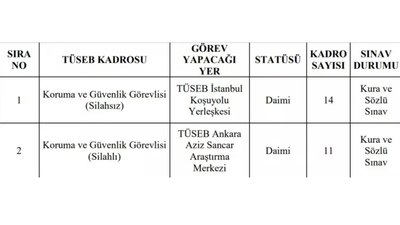 Türkiye Sağlık Enstitüleri Başkanlığı (TÜSEB) 25 kişilik personel istihdamı sağlayacağını duyurdu. 11 kişi Ankara ve 14 kişi İstanbul illerinde olmak üzere, 25 kişilik personel alımı yapılacak ve İstanbul alımları silahsız; Ankara alımları silahlı adaylardan yapılacak.