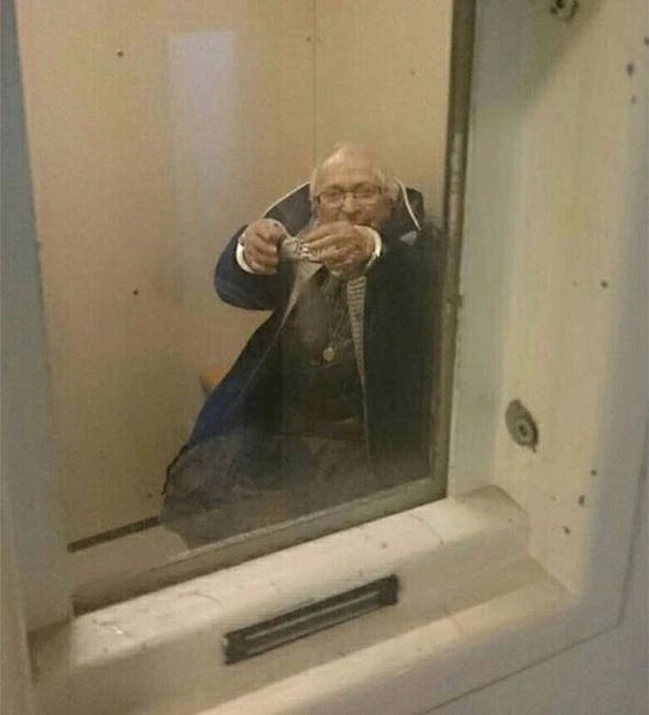 Yaşlı kadının ellerinde kelepçelerle hücresinde verdiği pozlar polis kameralarına işte böyle yansıdı...