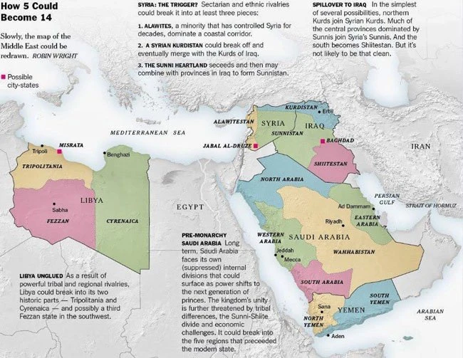 Haritaya göre en büyük parçalanma Suudi Arabistan'da yaşanacak. Ülkede yönetim, gelecekte prenslere geçtikçe kabile ayrımları derinleşecek; kuzey, güney, doğu ve batı Arabistan doğacak. Suriye'nin yanısıra Irak da 3'e bölünecek. Suriye'nin Akdeniz kıyısında alevi devleti, kuzeyi ile Kuzey Irak'ta bir Kürdistan devleti kurulacak.