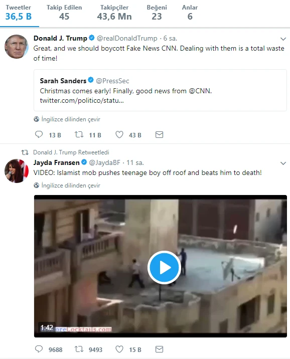 Trump'ın Twitter'da Fransen'in hesabında yer alan 3 İslamofobik videoyu yeniden paylaşması tepki çekti.ABD Başkanının, bazı şiddet olaylarını içeren ve bunlardan Müslümanları sorumlu tutan ifadelerle yayınlanan videoları yeniden paylaşmasına Fransen'dan yanıt geldi. Fransen, yanıtında büyük harflerle "Bu videoları yeniden paylaşan Donald Trump'ın kendisidir ve yaklaşık 44 milyon takipçisi vardır! Tanrı seni esirgesin Trump! Tanrı Amerika'yı esirgesin!" ifadelerini kullandı.