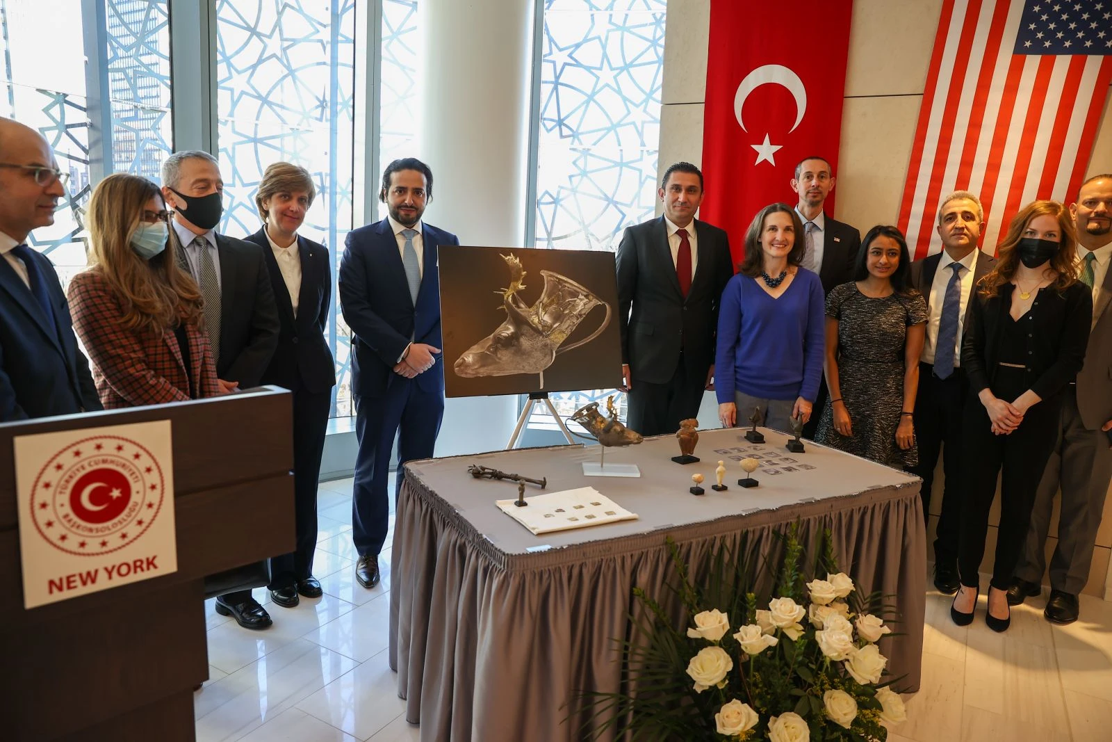 Türkevi'nde düzenlenen törende, tarihi eserler, Türkiye'nin New York Başkonsolosluğunca, ABD İç Güvenlik Bakanlığı ve Manhattan Bölge Savcılığı yetkililerinden teslim alındı. Başkonsolos Reyhan Özgür, törende yaptığı konuşmada, Türkiye'den kaçırılan 28 tarihi eserin iade sürecinin Kültür ve Turizm Bakanlığınca yürütülen çalışmalarla başarılı şekilde tamamlandığını söyledi.