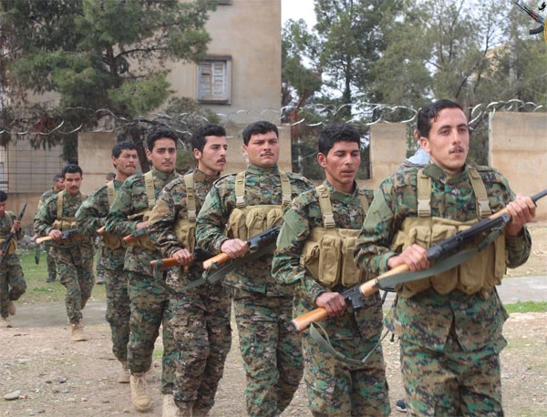 Askeri eğitimden geçiren onlarca kişinin yer aldığı karelerde, YPG bayrakları dikkat çekiyor.