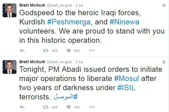 McGurk, sosyal medya hesabından yaptığı açıklamada, Irak Başbakanı Haydar el-İbadi'nin Musul operasyonunu başlattığını ve iki yıldır DAEŞ karanlığında bulunan Musul'u özgürleştirme operasyonunun başladığını duyurdu. Obama'nın DAEŞ ile Mücadele Özel Temsilcisi Brett McGurk'un bir diğer açıklaması ise, yerel güçlere destek niteliğindeydi. McGurk, 'Irak ordusunun, Peşmerge ve Ninova gönüllülerinin yolu açık olsun' şeklinde açıklama yaptı. Öte yandan McGurk, ''Bu tarihi operasyonda bulunmaktan onur duyuyoruz'' mesajını vermeyi de unutmadı.