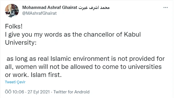 Rektör Mohammad Ashraf Ghairat tarafından yapılan Twitter paylaşımında, "Kabil Üniversitesi rektörü olarak size söz veriyorum, herkes için gerçek bir İslami ortam sağlanmadıkça kadınların üniversitelere girmesine, çalışmalarına izin verilmeyecek. Önce İslam" ifadelerine yer verildi.