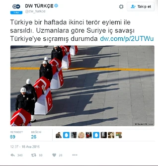 İstanbul ve Kayseri'deki son terör saldırılarını bahane ederek internet sitesinde "Suriye savaşının yeni cephesi: Türkiye" ve "Suriye iç savaşı Türkiye'ye sıçradı" başlıklarıyla haberler yapan ve teröre hizmet etmekten başka hiçbir amacı olmayan bu haberleri sosyal medya üzerinden yayan DW'ye Türkiye'den çok sert tepkiler geldi.