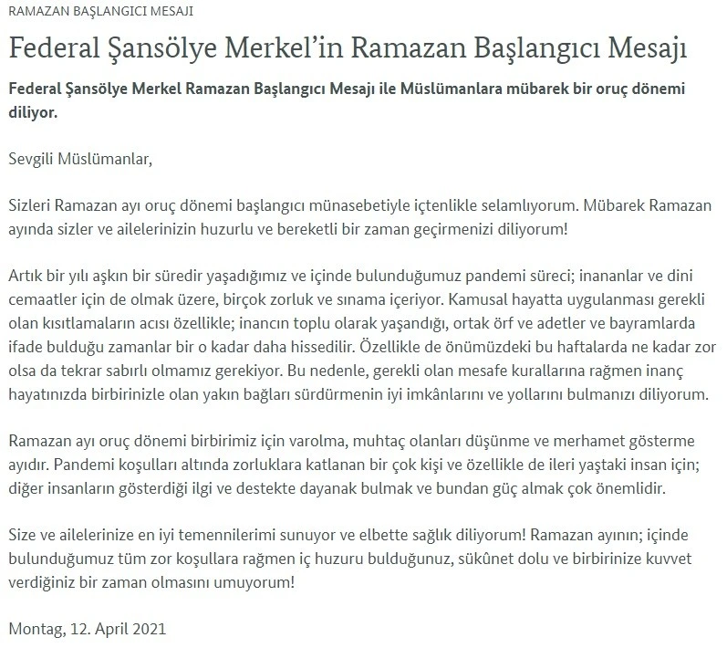 “Ramazan ayı oruç dönemi birbirimiz için var olma, muhtaç olanları düşünme ve merhamet gösterme ayıdır” diyen Merkel, “Pandemi koşulları altında zorluklara katlanan birçok kişi ve özellikle de ileri yaştaki insan için diğer insanların gösterdiği ilgi ve destekte dayanak bulmak ve bundan güç almak çok önemlidir” dedi.
