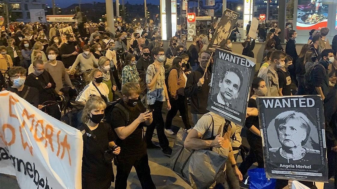 Göstericiler, 'Moria'dan Almanya'ya getirin, hemen şimdi', 'Yerimiz var', 'Sınırlara hayır' ve 'Sınır dışı etmeleri durdurun' sloganları atarak, üzerinde 'Tüm sığınmacı kamplarını kapatın', 'Moria iyi değil', 'Kampları boşaltın, hemen kabul edin', 'Moria yanıyor hemen tahliye edin' ve 'Yazıklar olsun Avrupa Birliği' yazan döviz ve pankartlar taşıdı.