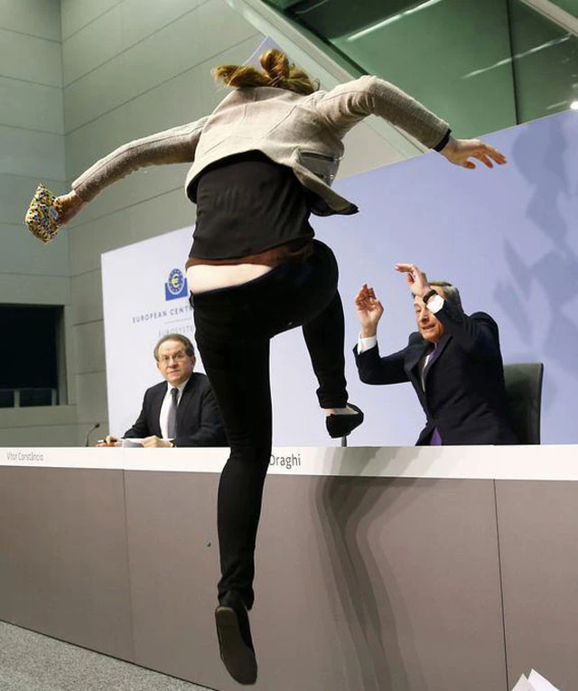 Nisan ayı faiz kararını açıkladıktan sonra basın toplantısı düzenleyen ECB Başkanı Mario Draghi'ye, basın toplantısı sırasında bir kadın konfeti fırlattı.