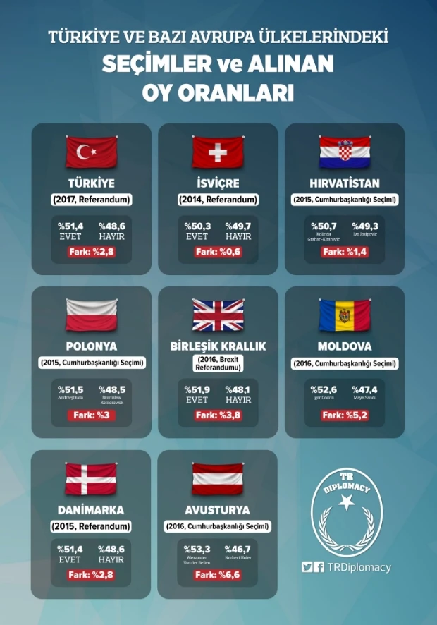Diğer Avrupa ülkelerinde ise referandum sonuçları Türkiye'den çok farklı değildi. 8 farklı ülkenin referandum oylamalarında oy oranlarının yüzde 53'ü aşmadığı görüldü. Ancak bu ülkelerde sonucun "tartışmalı" olacağı düşünülmedi..