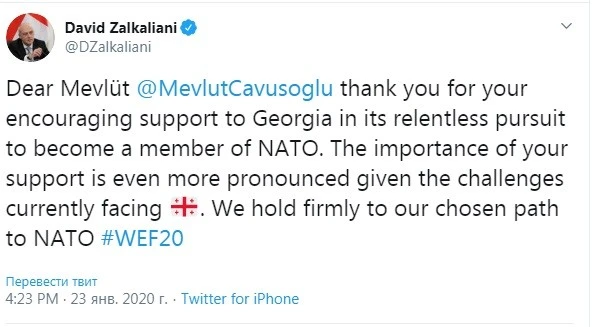 Türkiye Dışişleri Bakanı Mevlut Çavuşoğlu, Davos'taki Dünya Ekonomik Forumu kapsamında Gürcistan'ın NATO'ya katılımının önemli olduğunu ifade etmişti.