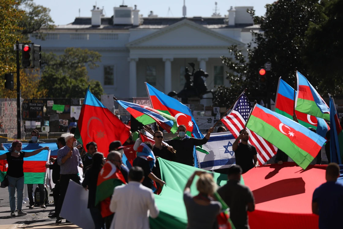 Azerbaycan ve Türk bayraklarıyla Beyaz Saray'ın önüne gelen iki yüz civarındaki eylemci, Azerbaycan lehine sloganlar attı.