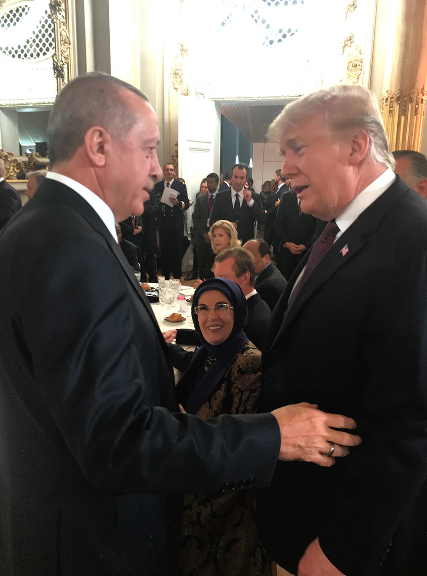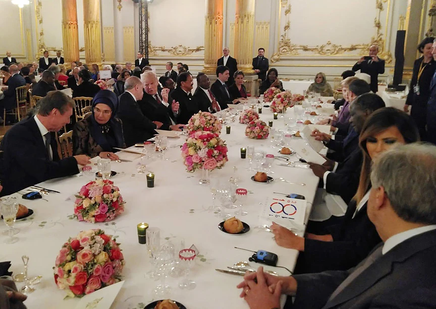 Türkiye Cumhurbaşkanı Recep Tayyip Erdoğan ile ABD Başkanı Donald Trump, Fransa Cumhurbaşkanı Emmanuel Macron tarafından devlet, hükümet ve uluslararası kuruluş başkanları ile eşleri onuruna verilen akşam yemeğinde bir süre sohbet etti.