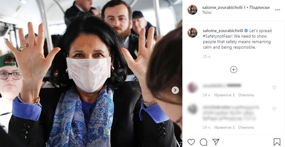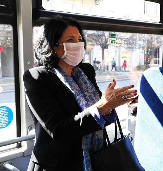 Gürcistan’da Korona virüs vakalarına rastlanmasıyla harekete geçen Gürcistan Devlet Başkanı Salome Zurabişvili, #SafetynotFear hashtagiyle maske takıp otobüse bindiği fotoğraflarını sosyal medya hesabında paylaştı.