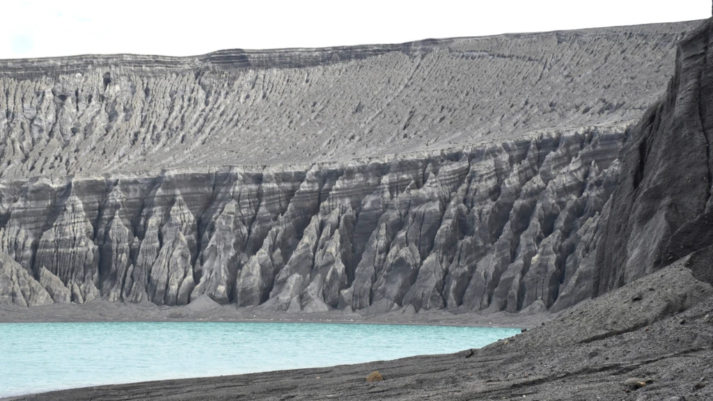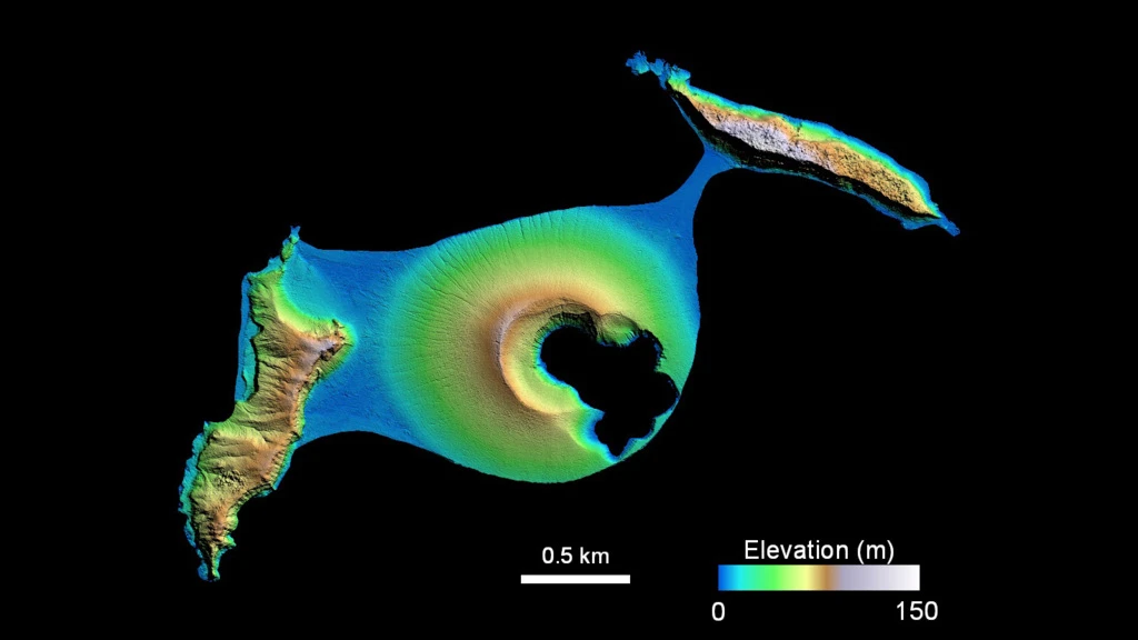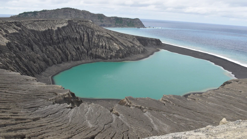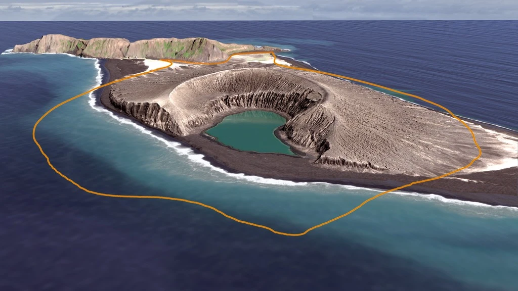 Yaklaşık 1 kilometre uzunluğunda, 2 kilometre genişliğinde ve 100 metre yüksekliğinde olduğu açıklanan yeni adanın ortasında yeşil renkli suyla dolu bir krater gölü bulunuyor.