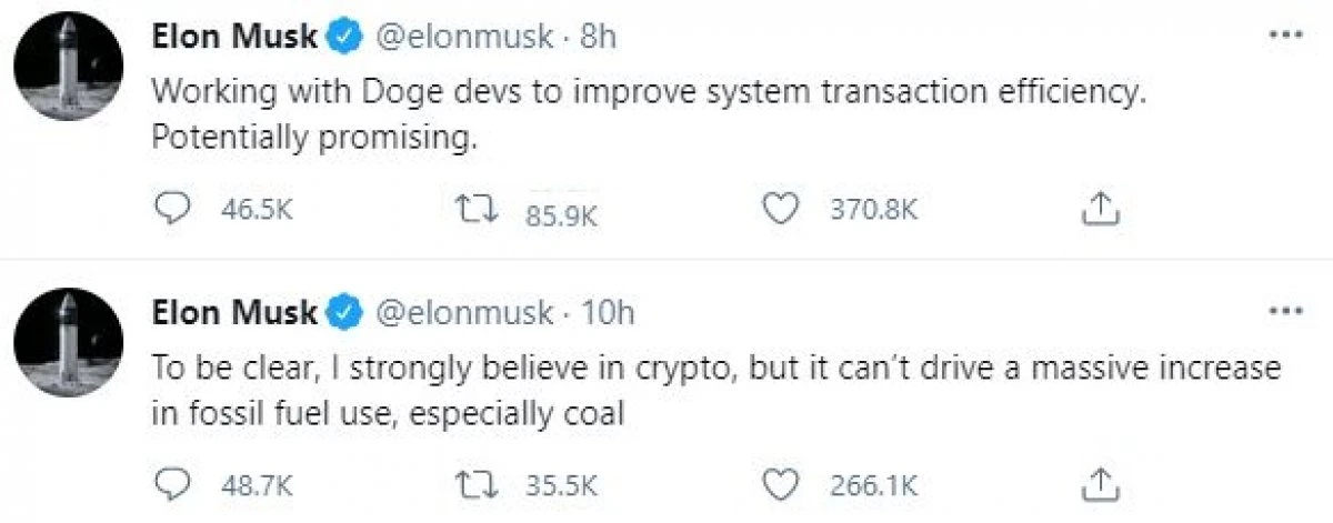 Birkaç gün önce "Doge uzaya giden ilk kripto olacak" şeklindeki paylaşımı ile bu kripto paranın yükselmesinde rol oynayan Musk, yaptığı açıklama ile kripto para piyasasına darbe vurdu. Twitter hesabından yaptığı yeni açıklama ile kripto paralara inandığını ancak fosil yakıtların büyük oranda kullanımına yol açmaması gerektiğini ifade etti.
