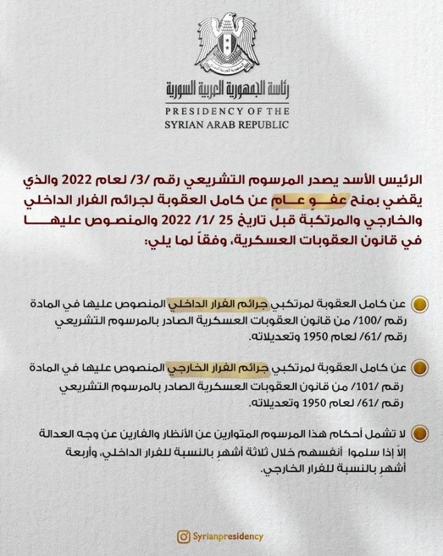 Devlet ajansı Sana da haberi, "Cumhurbaşkanı Beşar Esed bugün, 25.1.2022 tarihinden önce dahili ve harici firar suçu işleyenler için cezanın tamamına ilişkin genel af içeren kanunu çıkardı" ifadeleriyle duyurdu.