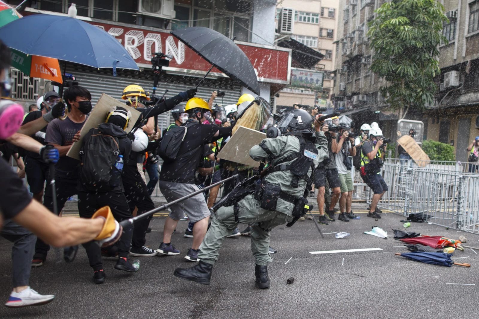 Bazıları şemsiye taşıyan, bazıları maske takan protestocular, Yuan Long metro istasyonu saldırısında göstericilerin darbesine polisin müdahale etmekte gecikmesine tepki olarak, "Hong Kong polisi yasayı biliyor ve çiğniyor." sloganları attı. Hong Kong Emniyeti, bölge sakinleri ile göstericiler arasında çatışma riski taşıdığı gerekçesiyle izin vermediği yürüyüşün başlamasından 3 saat sonra göz yaşartıcı gazla protestoculara müdahale etti.Diğer yandan Hong Kong yönetiminden yapılan açıklamada, bazı göstericilerin demir çubuklar, çitler taşıdığı, içlerinde polis bulunan emniyet araçlarına zarar verdiği ve yürüyüşün dağıtılacağı belirtildi. Şehrin toplu ulaşım ağı, trenlerin bugün Yuen Long metro istasyonunda durmayacağını duyurmuştu.Yürüyüş öncesi bölgedeki çok sayıda iş yeri ve kamu binası kapatıldı.