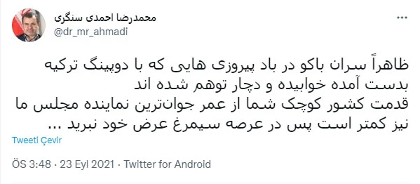 Sosyal medya platformu Twitter'da kişisel hesabından paylaşım yapan İranlı vekil Ahmadi, Azerbaycan Cumhuriyeti yerine Bakü Cumhuriyeti ifadesini kullanarak şunları yazdı: