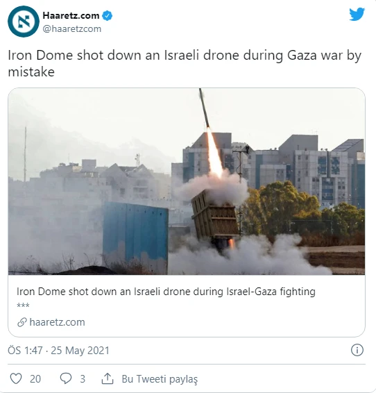 İsrail ordu radyosunun verdiği habere göre, “Demir Kubbe” sistemi yanlışlıkla bir ordu İHA’sını düşürdü. Olayla ilgili soruşturmanın sürdürüldüğüne dair bilgi verilirken İHA’nın türüne ilişkin bilgi verilmedi.
