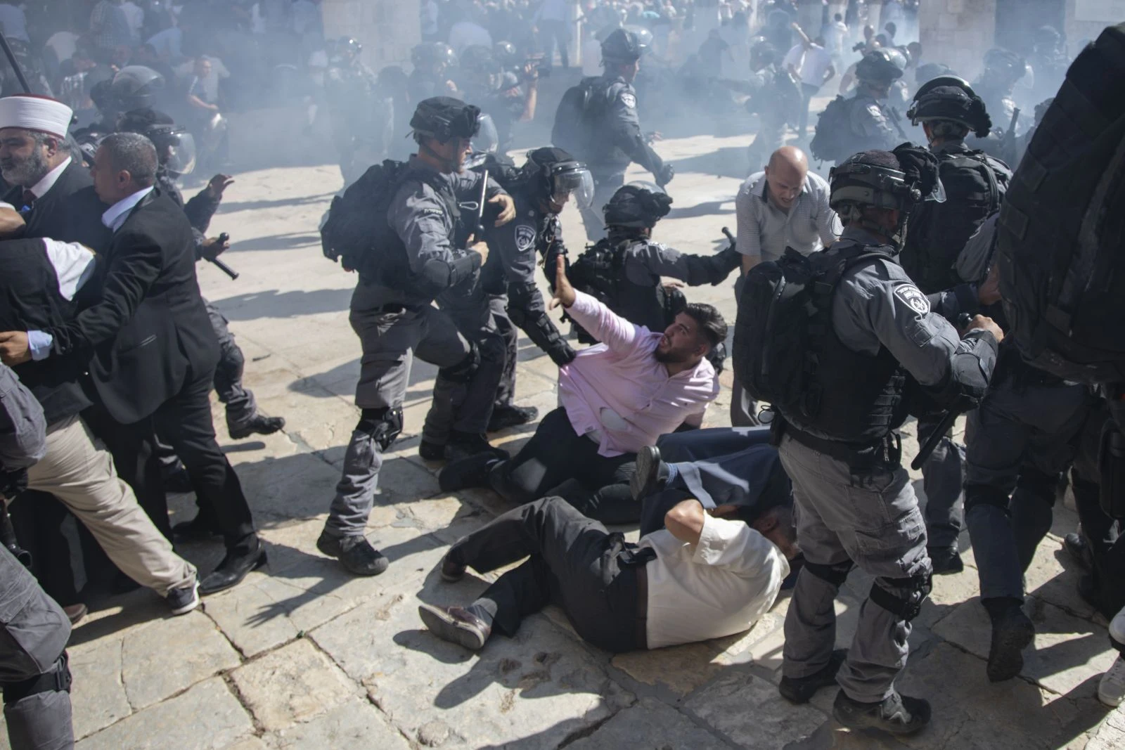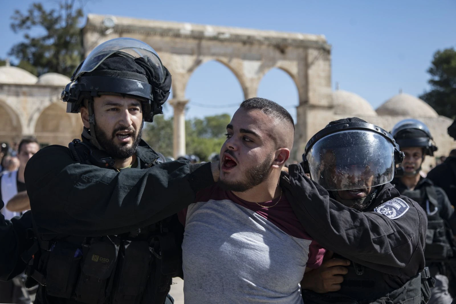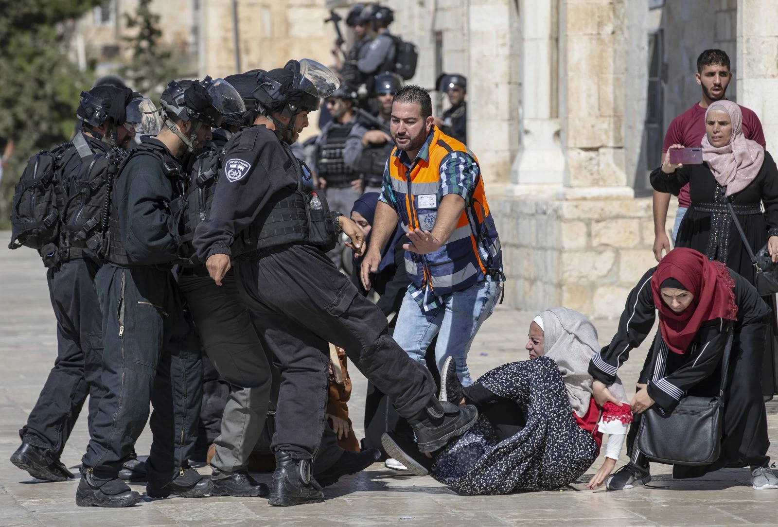 İşgal altındaki Doğu Kudüs’ün Eski Şehir bölgesinde bulunan Mescid-i Aksa’da fanatik Yahudilerin baskınlarını durdurmak için bir saat gecikmeli kılınan bayram namazı sonrası Harem-i Şerif’in batı yakasındaki El-Meğaribe Kapısı’nda toplanan yüzlerce Filistinli, İsrail polisinden fanatik Yahudilere kapıyı açmamasını istedi.