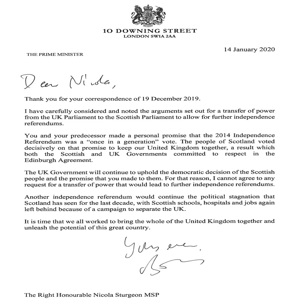 İngiltere Başbakanı Boris Johnson, bağımsızlık referandumu için talepte bulunan İskoçya Bölgesel Yönetimi Başbakanı Nicola Sturgeon hükümeti tarafından sunulan dilekçeyi reddetti. Johnson, İskoçya Başbakanı Sturgeon’a gönderdiği mektupta, "Daha fazla referanduma yol açabilecek yetki devri için herhangi bir talebi kabul etmiyorum" cevabını verdi.