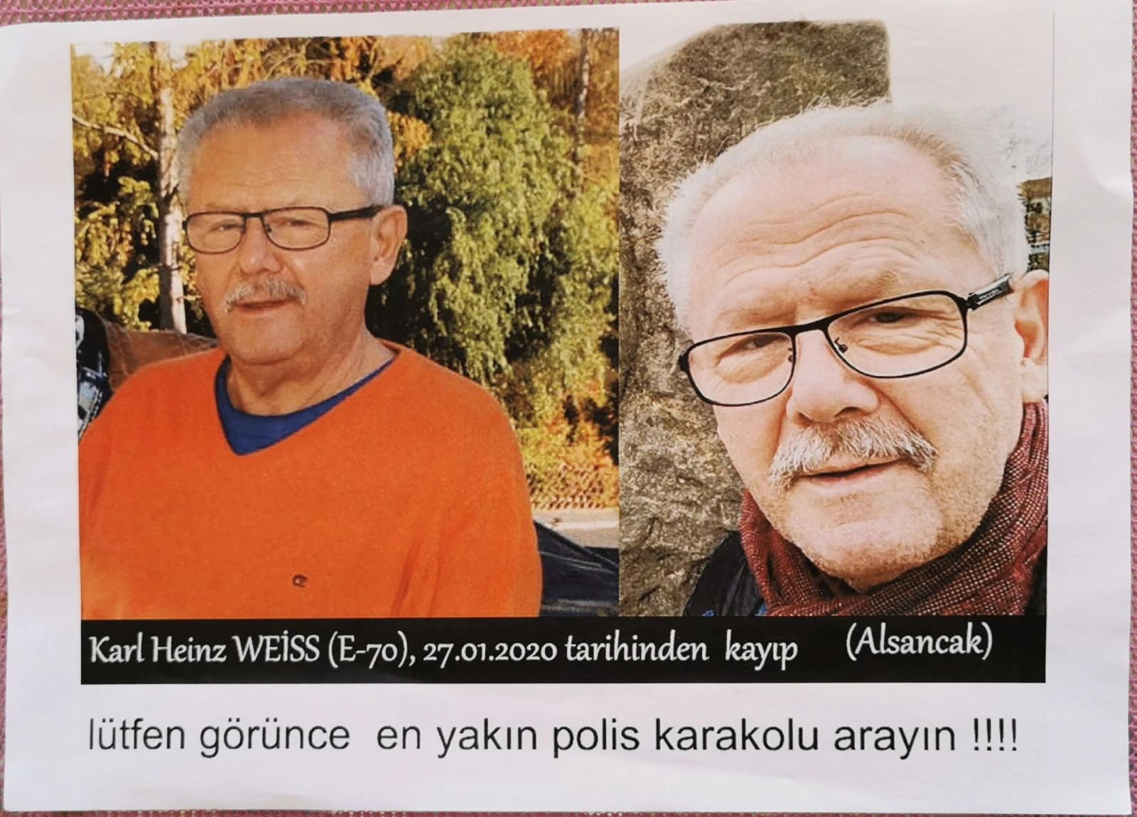 Kuzey Kıbrıs Türk Cumhuriyeti'ne (KKTC) geçtiğimiz 24 Ocak'ta tur kafilesiyle gelen 69 yaşındaki Alman turist Karl Heinz Weiss'den 27 Ocak'tan bu yana haber alınmıyor. 27 Ocak'ta Girne'ye bağlı Alsancak köyünde bulunan Riverside tatil köyünde arkadaşlarıyla akşam yemeği yiyen Weiss'in daha sonra kayıplara karıştığı belirtildi. Weiss'in hayatından endişe eden oğlu Lars Laufer ise babasını bulmak için özel bir rehber eşliğinde KKTC'ye gelip yetkililerden yardım istedi. Alman turistin oğlu ayrıca, babasını görenlere seslenerek polise ihbarda bulunmalarını istedi.