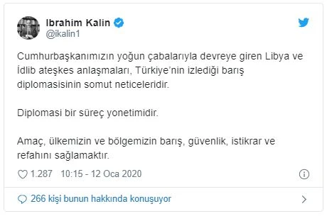 Cumhurbaşkanlığı Sözcüsü Kalın, "Cumhurbaşkanımızın yoğun çabalarıyla devreye giren Libya ve İdlib ateşkes anlaşmaları, Türkiye'nin izlediği barış diplomasisinin somut neticeleridir. Diplomasi bir süreç yonetimidir" dedi.