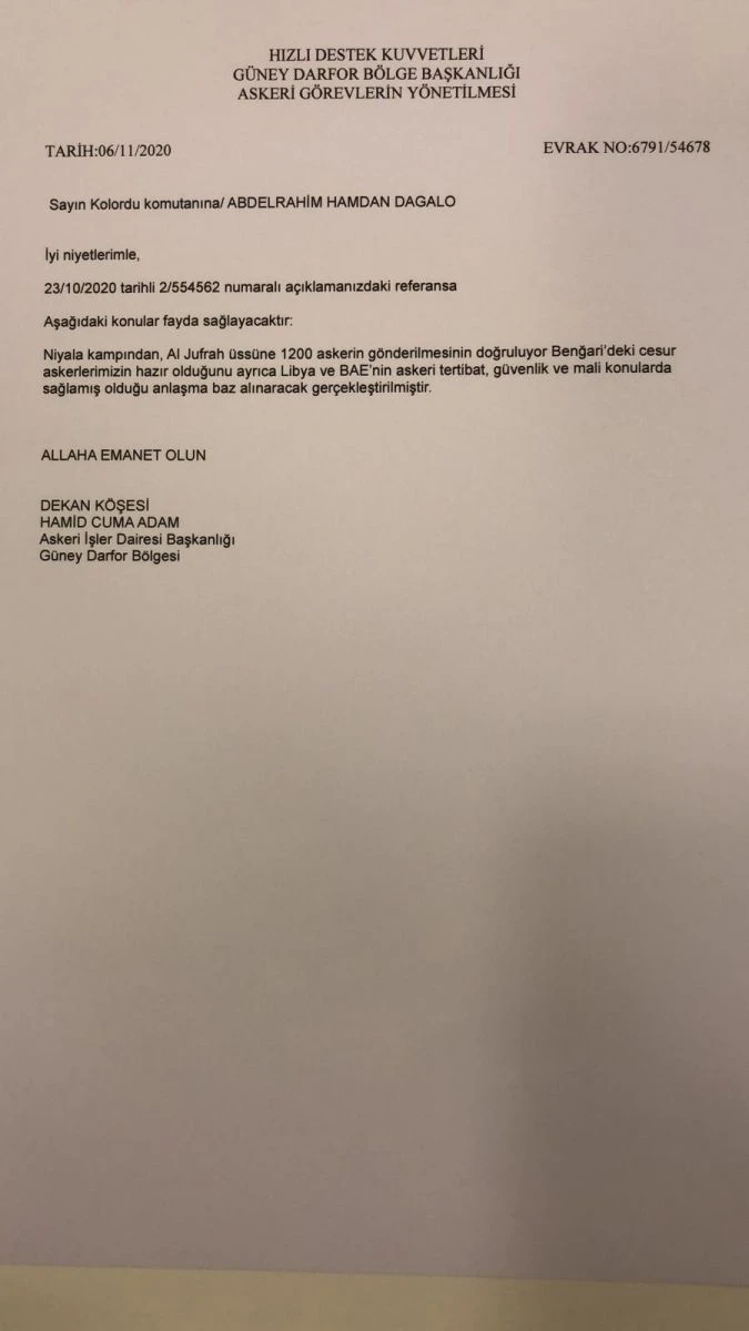 Kolordu Komutanı Muhammed Hamdan Dagalo’ya hitaben 6 Kasım'da yazılan mektupta Hafter'e bağlı güçler ve BAE’nin askeri tertibat, güvenlik ve mali konularda sağlamış olduğu anlaşma temel alınarak hazırlanan bin 200 kişilik milis grubun Niyala kampından Cufra üssüne gönderilmek için hazır olduğu bilgisi yer aldı.