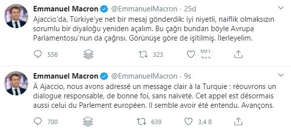 Korsika'da yapılan Med7 toplantısına gönderme yapan Macron, "Ajaccio'da, Türkiye'ye net bir mesaj gönderdik: iyi niyetli, naiflik olmaksızın sorumlu bir diyaloğu yeniden açalım. Bu çağrı bundan böyle Avrupa Parlamentosu'nun da çağrısı. Görünüşe göre de işitilmiş. İlerleyelim." ifadelerini kullandı.