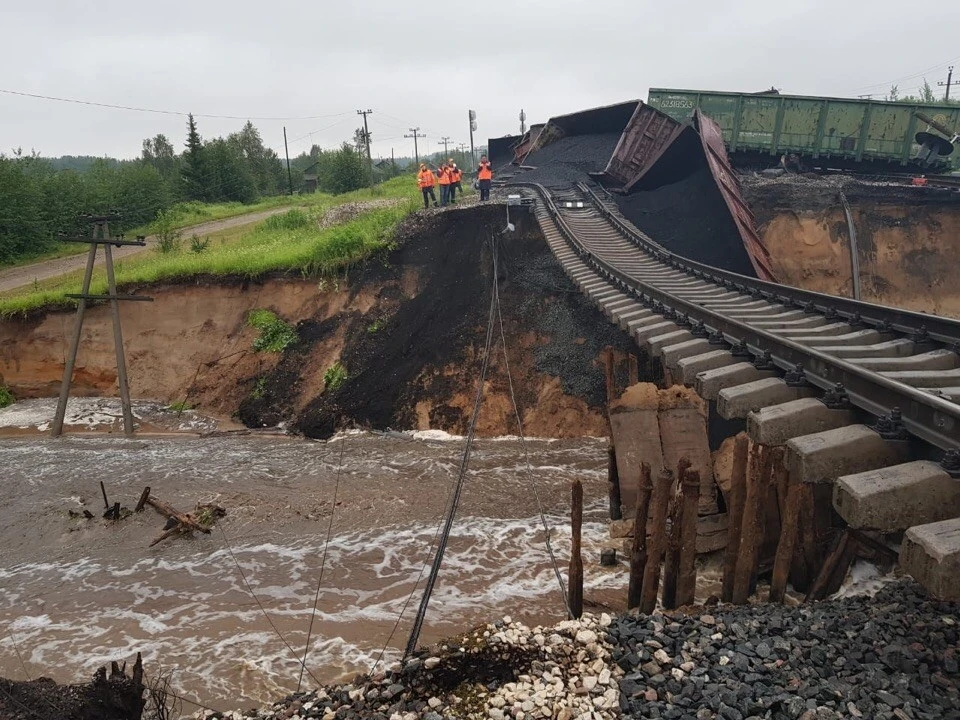 Rusya’ya bağlı Komi Cumhuriyeti’nin Sıktıvkar şehrinde aşırı yağışlar nedeniyle menfezin çökmesi sonucu bir yük treni raydan çıktı.