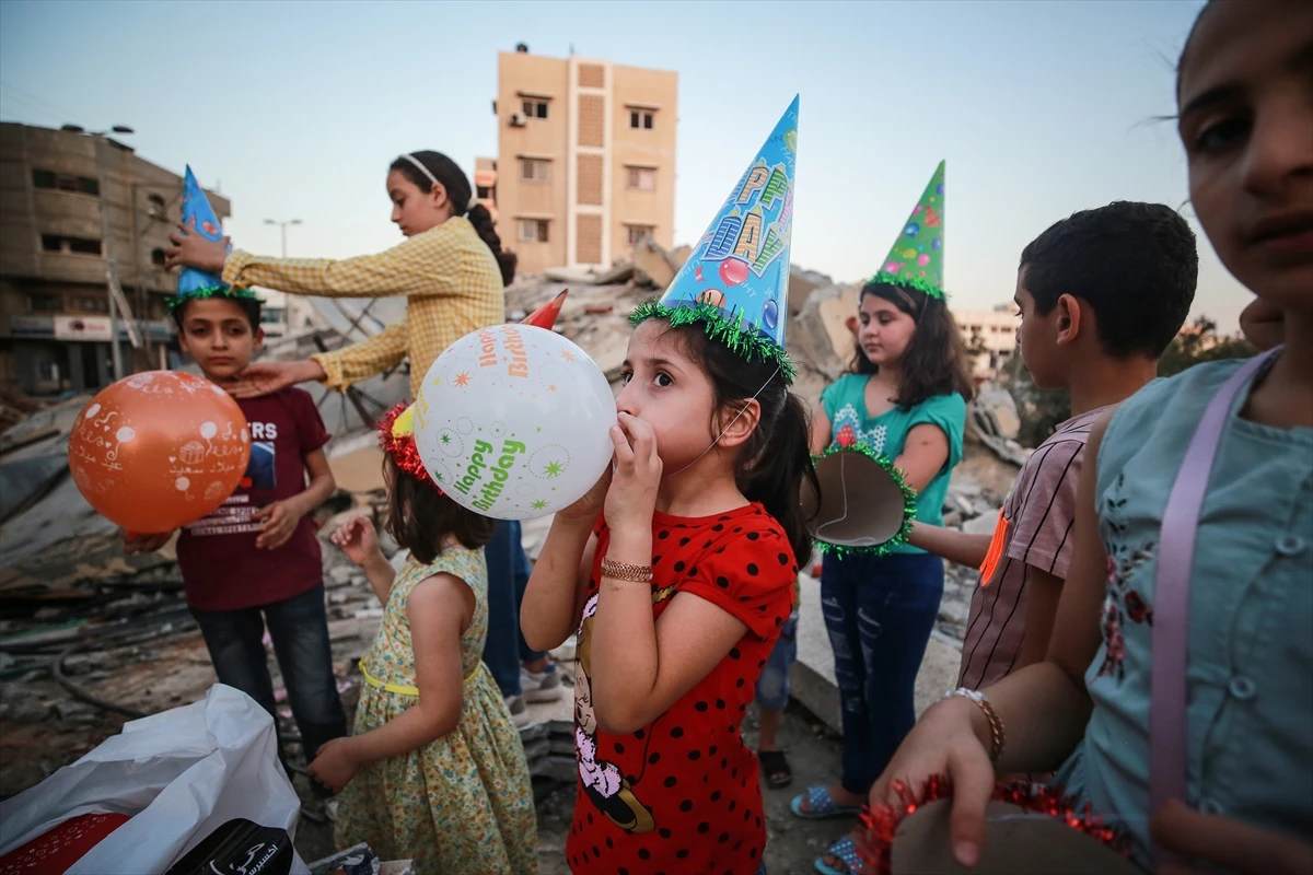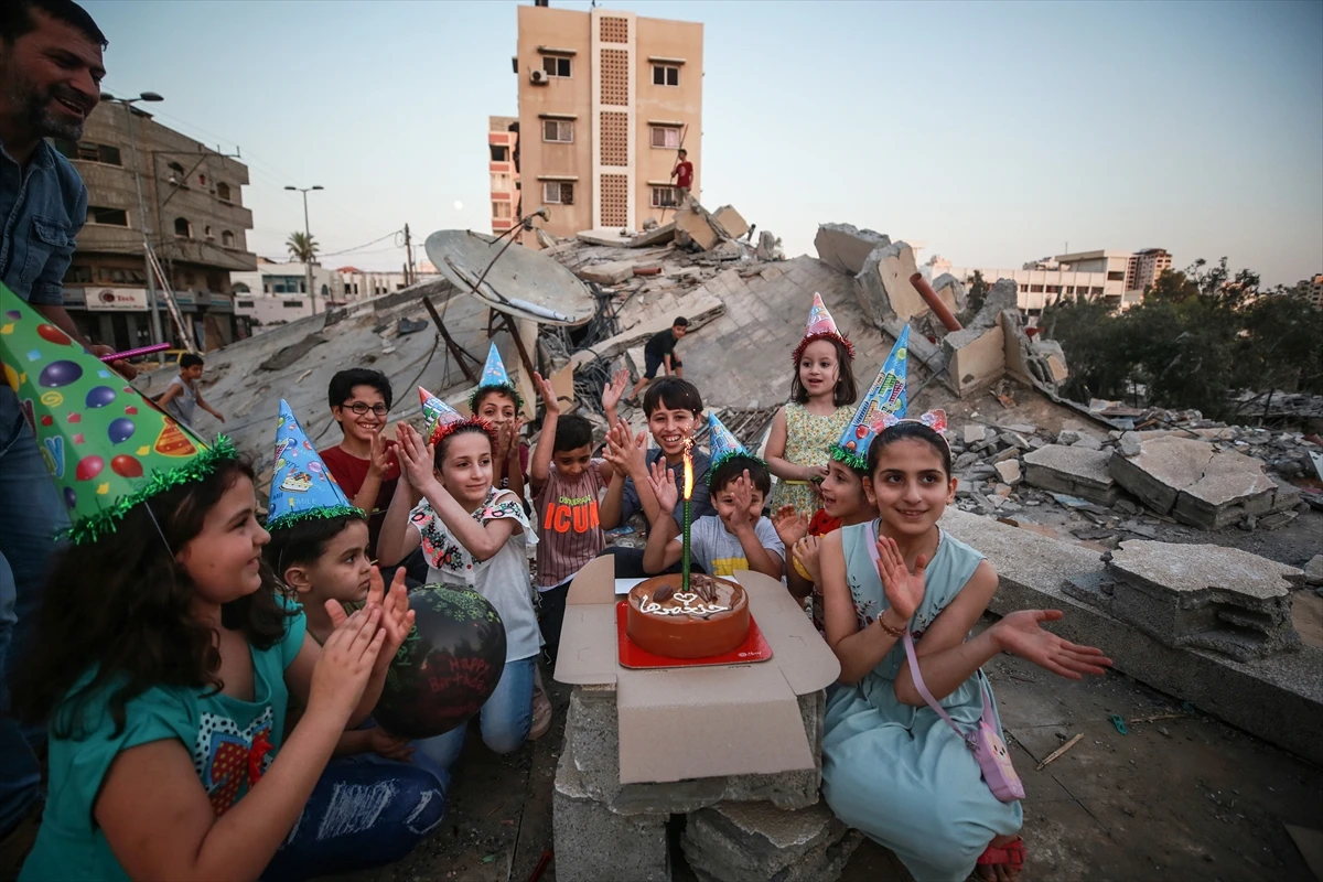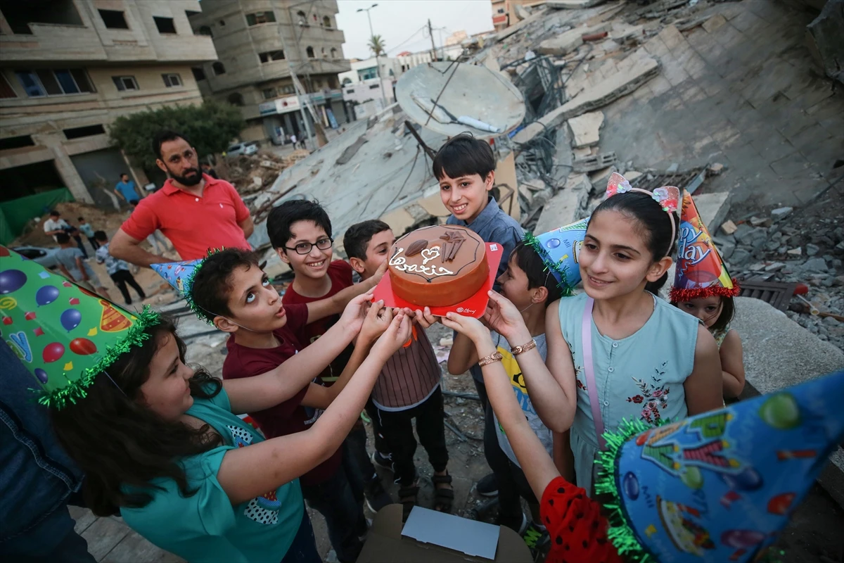 İşgalci İsrail ordusunun Gazze Şeridi’ne düzenlediği saldırılarda evleri yıkılan Filistinli aile, 13 yaşındaki oğullarının doğum gününü hain saldırılarda yıkılan evlerinin üzerinde kutladı. Aile tüm olanlara rağmen dünyaya ders niteliğinde duruş gösterdi. Enkazdan çıkardıkları briketleri üst üste koyarak masa yapan, üzerine de doğum günü pastasını yerleştiren Sabbih ailesi, balonlar ve doğum günü süsleriyle de taş yığınları arasında sıcak ve renkli bir görüntü oluşturdu.