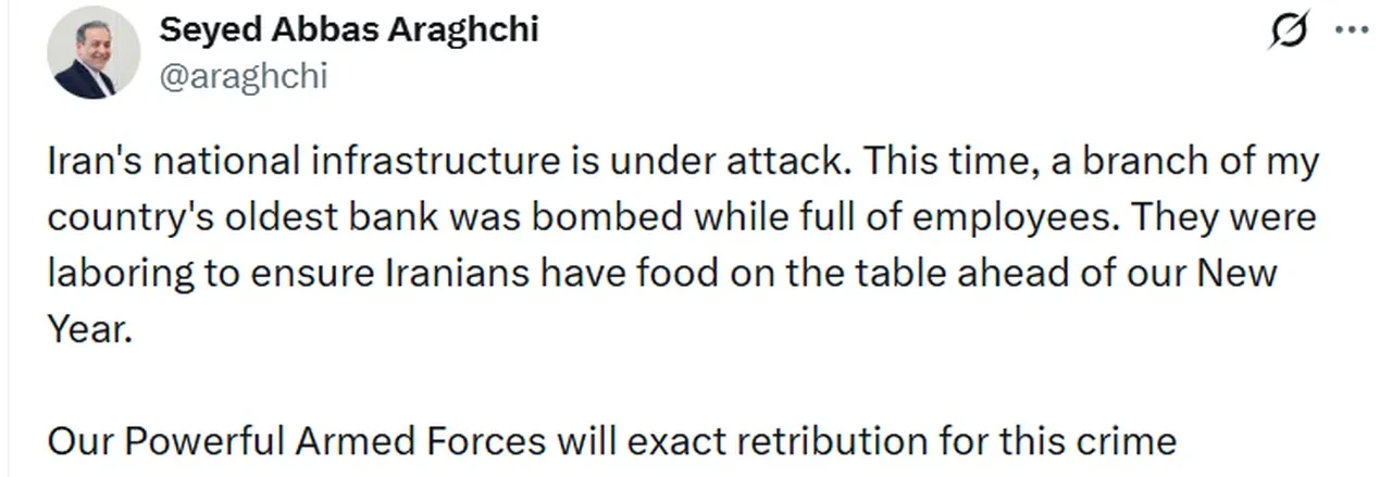 İran Dışişleri Bakanı Abbas Arakçi, sosyal medya hesabından yaptığı açıklamada, İran'ın ulusal altyapısının saldırı altında olduğunu söyledi. Son olarak ülkenin en eski bankasının bir şubesinin çalışanlarla doluyken bombalandığını aktaran Arakçi, "Buradakiler, İran yeni yılı öncesinde İranlıların sofralarında yemek olmasını sağlamak için çalışıyorlardı" dedi. Arakçi, "Güçlü silahlı kuvvetlerimiz bu suça gerektiği şekilde karşılık verecektir" ifadelerini kullandı.