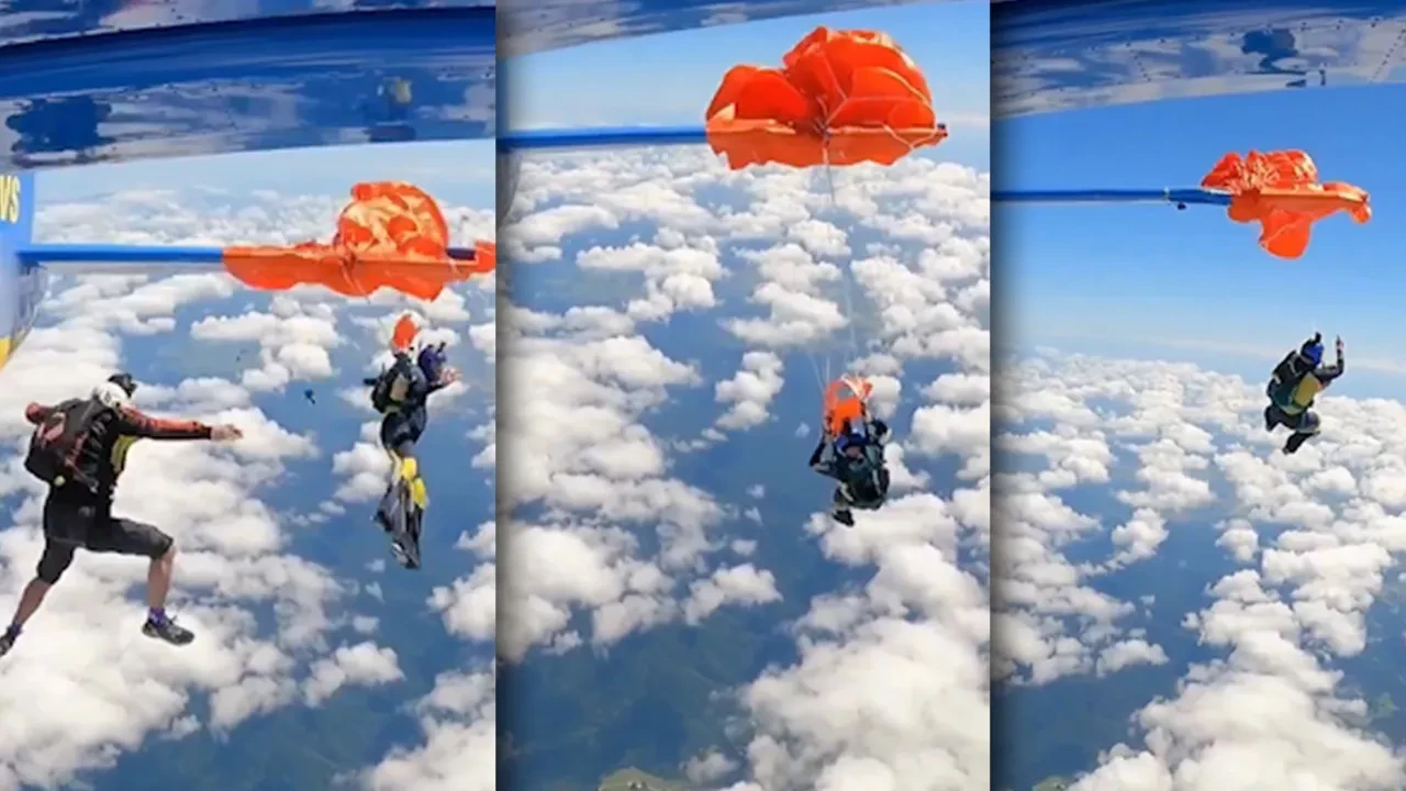 Avustralya'da paraşütçüler havada korkunç anlar yaşadı. Bir paraşütçünün atlayışı sırasında yedek paraşütünün kolu takıldı ve kazara açıldı. Paraşütçü açılan paraşütü nedeniyle uçağın kanadına takıldı ve orada asılı kaldı. Paraşütçü, uçaktan atladığı sırada bir başka arkadaşına da çarptı ve onun serbest düşüş gerçekleştirmesine neden oldu.