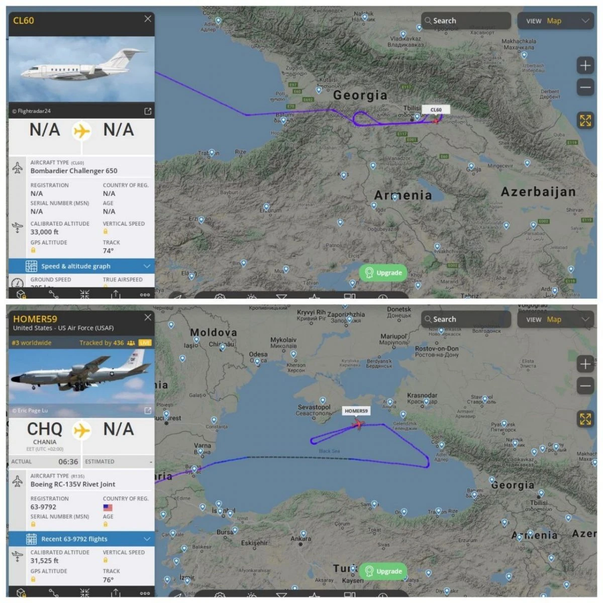 PlaneRadar gözlem sitesinin radar çizelgesine göre, ABD'ye ait Artemis CL-600 tipi bombardıman uçağının Karadeniz üzerinden Gürcistan'ın başkenti Tiflis'e ulaştığı, ardından ise Batum ve Karadeniz üzerinden dönüş yaptığı görüldü. RC-135V tipi keşif uçağının ise Karadeniz üzerinde ilerlerken Kırım açıklarına ve bir manevra ile de Kerç boğazına yaklaştığı sonrasında ise Rus savaş uçaklarının takibi ardından döndüğü anlaşıldı.