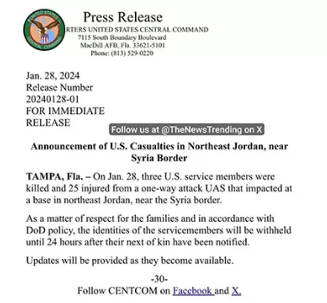 ABD Merkez Kuvvetler Komutanlığı (CENTCOM), Ürdün’ün Suriye sınırında bir ABD karakoluna yapılan saldırıyı teyit etti. CENTCOM, 3 ABD askerinin öldürüldüğünü en az 25 askerin yaralandığını bildirdi.