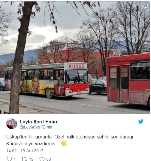 Makedonya'nın başkenti Üsküp'te bir özel halk otobüsünün sahibi, otobüsün son durağının yazıldığı kısma 'KUDÜS' yazdırdı.Üsküplü şoförün bu hareketi sosyal medyada pek çok kişinin dikkatini çekti.Üsküp'te geçtiğimiz haftalarda bir grup Müslüman, ABD'nin Kudüs kararını protesto etmişti. Makedonya’nın başkenti Üsküp’te bir grup öğrenci, Murat Paşa Camii önünde toplanarak ABD BaşkanıDonald Trump’ın Kudüs’ü “İsrail’in başkenti” olarak tanımasını protesto etmek üzere gösteri düzenledi.