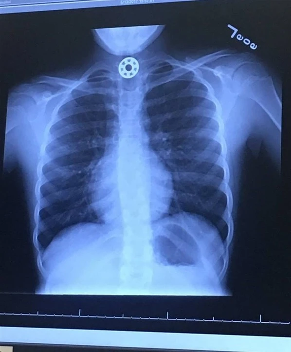 Houston'ın hemen kuzeyinde, The Woodlands'daki Texas Çocuk Hastanesine götürülen çocuğun yutağında bilye büyüklüğünde bir şeyin sıkıştığı görüldü ve hemen ameliyat yapılması gerektiği söylendi.