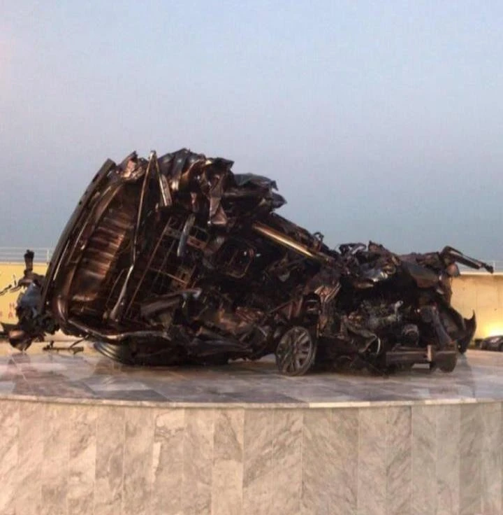 Süleymani ile Mühendis’in ölüm yıldönümü yaklaşırken, ABD’nin saldırısı sonucu parçalanan araçlardan geriye kalanlar herkesin görebilmesi için yol üzerinde bir noktaya yerleştirildi.