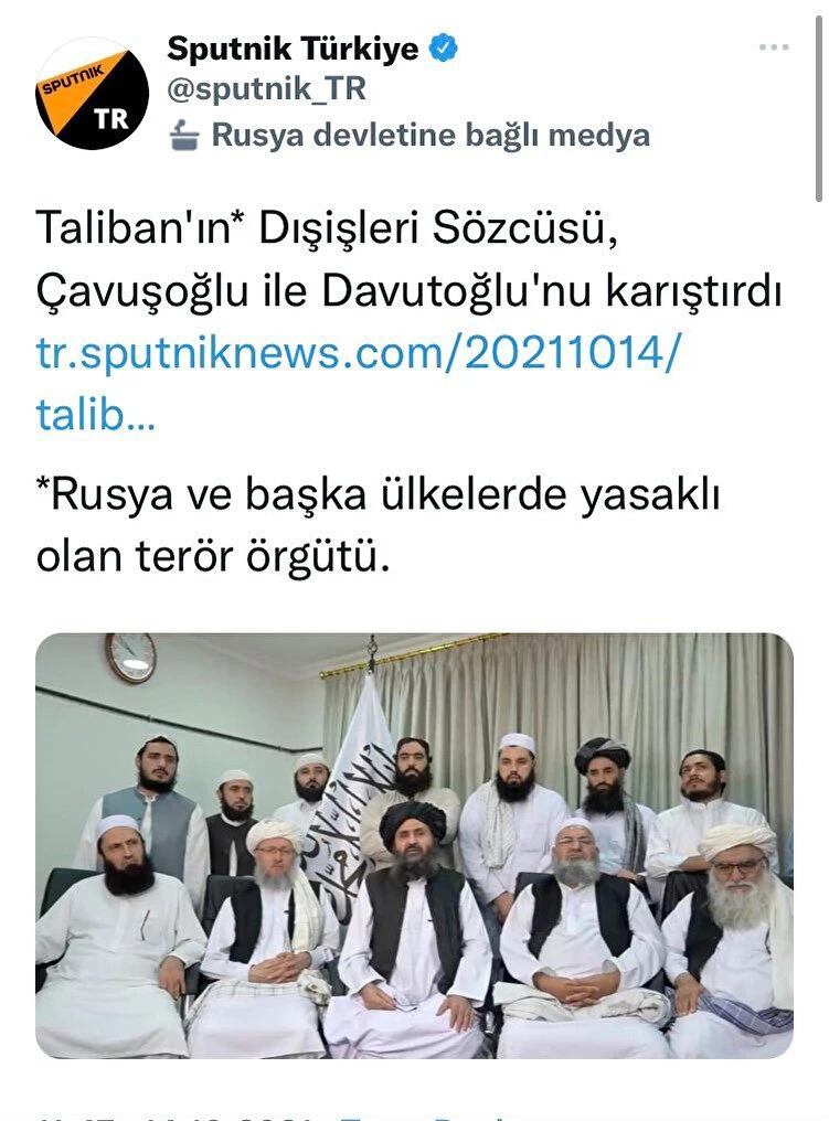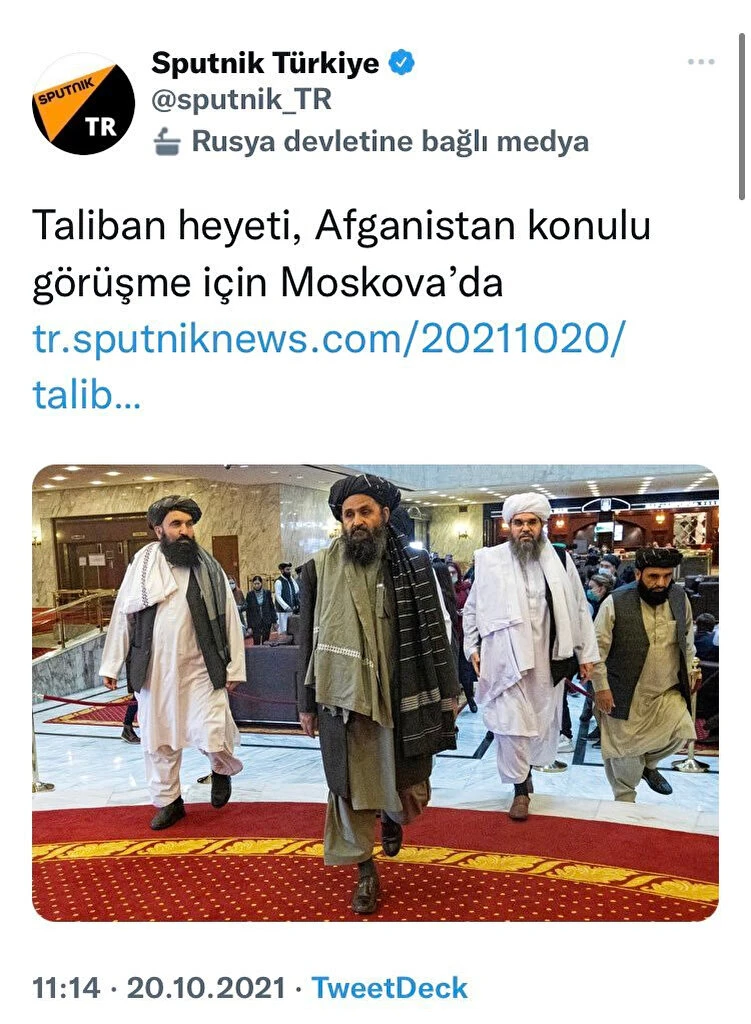 Rusya hükümetine bağlı Rossiya Segondnya tarafından kurulan Moskova merkezli medya kuruluşu rus resmi ajansı Sputnik, Taliban için haberlerinde şimdiye kadar hep ''Terör örgütü Taliban'' ifadelerini kullanıyordu. Hatta son olarak Taliban heyetinin Türkiye'ye gelmesini haberleştiren Sputnik, haberin sosyal medya paylaşımında ''Rusya ve başka ülkelerde yasaklı olan terör örgütü'' notunu düşmüştü.