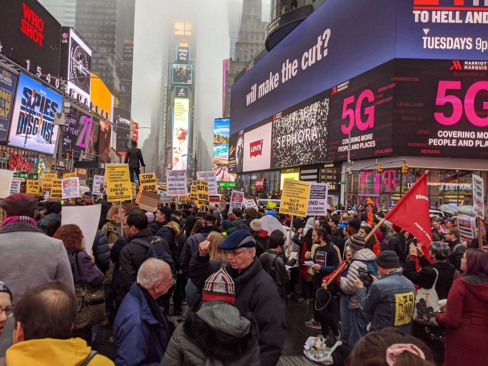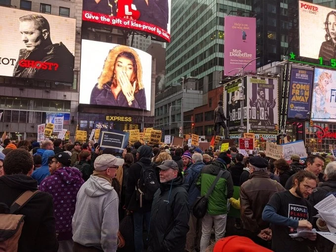 Gösterilerin en büyüğü ise New York'ta bulunan ünlü Times Meydanı'nda gerçekleştirildi. Popüler Direnç, Pembe Kod, Barış Gazileri ve Barış için Sesler adlı sivil toplum kuruluşlarının düzenlediği gösterilerde Times Meydanı'nda toplanan yüzlerce savaş karşıtı, ABD'nin İran'a savaş açmaması yönünde çağrıda bulundu.